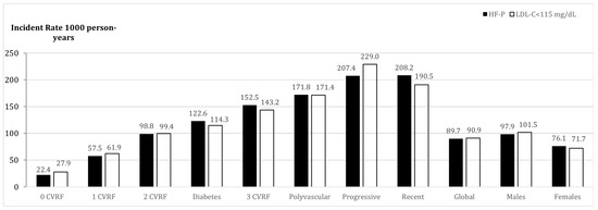 Incidence rate (per 1000 person-years) of ASCVD in secondary prevention in FH-P vs. normolipidemic population based on the presence of number of cardiovascular risk factors and clinical associated characteristics. ASCVD: Atherosclerotic Cardiovascular Disease; CVRF: Cardiovascular Risk Factor; HF-P: Familial Hypercholesterolemia; CLDL: Cholesterol-LDL.