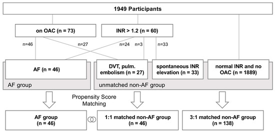 Patient Inclusion. In this retrospective study, 1949 participants in a CRC (colorectal cancer) screening program were included. Participants with AF (atrial fibrillation) were identified by investigation of detailed medical records those individuals under treatment with OAC (oral anticoagulation) and with elevated INR (international normalized ratio). This resulted in a cohort of 46 patients with AF, which were matched with 46 (1:1) and 138 (3:1) non-AF participants utilizing age- and gender-based propensity scores.