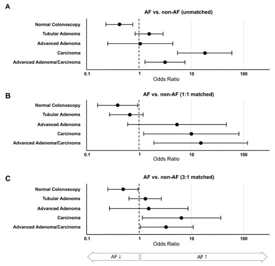 CRC (colorectal cancer) Screening Results. Comparing AF (atrial fibrillation) and non-AF participants (A unmatched, B 1:1 matched and C 3:1 matched), odds ratios for a normal colonoscopy, tubular adenoma (benign), advanced adenoma (premalignant), and carcinoma were calculated. The odds ratio for a combined endpoint of advanced adenoma and carcinoma was calculated because of its clinical significance. While normal colonoscopy was more significantly common in non-AF controls, there was a significantly increased risk of advanced neoplasias in AF participants across all comparisons.