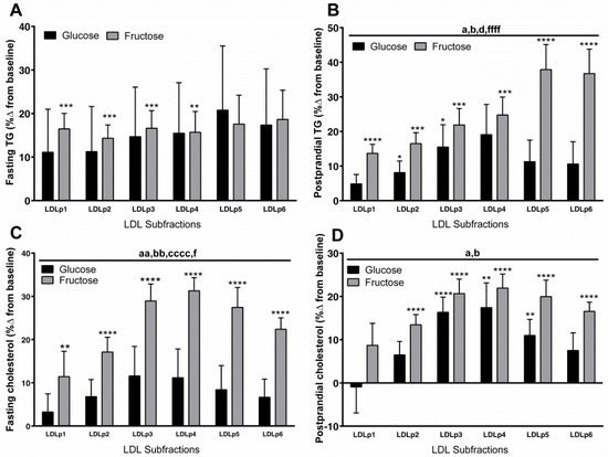 | LDL TG–FST | 24.7 ± 2.3 | 26.1 ± 2.2 | 6.3 ± 6.3 | 23.7 ± 2.5 | 26.8 ± 2.9 | 13.9 ± 5.3 **** |