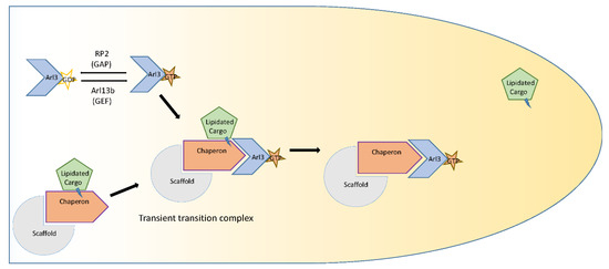An interesting mode of chaperone-mediated, myristoylated/prenylated protein delivery to the cilia has been recently identified. Two novel proteins, UNC119A and UNC119B, have been shown to act as chaperones. These novel proteins have specificity for a diverse subset of myristoylated proteins, such as G-protein α subunits [74], NPHP 3 [75] and Src-type tyrosine kinase and deliver them to the cilium. UNC119 polypeptides bind lauroyl (C12) and myristoyl (C14) side chains via a hydrophobic pocket, formed by an immunoglobulin-like β-sandwich fold. Once the cargo-bound chaperones reach the cilium, Arl3-GTP releases the cargo from the chaperone by allosteric displacement, delivering the proteins to the cilium [75,76,77,78]. The targeting of NPHP 3 to the cilia requires Arl3, UNC119B (not UNC119A) and the Arl3 GAP RP2. Knockdown of the Arl3 system reduces the percentage of cilia with localized NPHP 3 [75]. This is a sophisticated delivery system, wherein the lipids do not merely act as a membrane tethering chain, but as a specific binding site for protein–protein interactions (Figure 1).