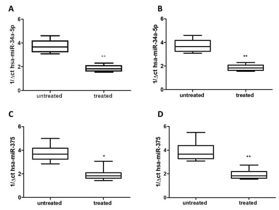 Using qRT-PCR analysis, we detected a significant decrease of about 50% for hsa-miR-34a-5p in both serum (Figure 2A) and saliva (Figure 2B) of treated patients (Group 1) compared to untreated patients (Group 2) (p < 0.01), without difference respect to age or gender. Similarly, in both serum and saliva, qRT-PCR analysis revealed a significant decrease (about 50%) of hsa-miR-375 levels in treated patients (Group 1) compared to untreated ones (Group 2) (p < 0.05 and p < 0.01) (Figure 2C,D), without difference with respect to age or gender.