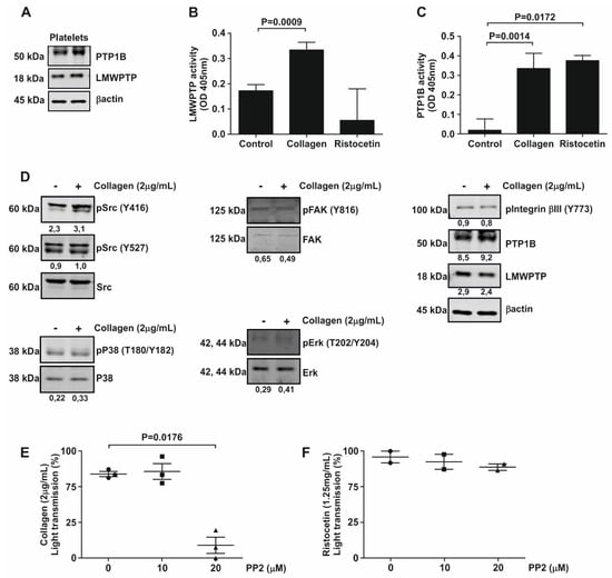 Platelets contain LMWPTP and PTP1B activity, which are selectively activated by platelet agonists. (A) Western blot analysis of platelets from two independent donors indicates protein expression of LMWPTP and PTP1B in these cells. (B,C) Platelets were stimulated with either collagen (2 µg/mL) or ristocetin (1.25 mg/mL) and LMWPTP (B) and PTP1B (C) were immunoprecipitated from the platelet lysates and subjected to phosphatase activity assay. Statistical analysis was performed using t-student (paired, 95% confidence intervals, two tailed) (n = 4). (D) Platelets were stimulated with collagen (2 μg/mL) and subjected to western blot analysis of the indicated (phospho-)proteins. β-actin served as a loading control. (−) Without collagen; (+) With collagen. The numbers under the blot indicate densitometry values corrected for loading controls. A representative blot of at least two independent experiments is shown. (E,F) Following pre-incubation with PP2 for 5 min, platelets were stimulated with either collagen (2 μg/mL) (E) or ristocetin (1.25 mg/mL) (F) and the aggregation was measured for 10 min. Each data point corresponds to an individual single experiment, indicated by: Circle—0 μM; Square—50 μM and Triangle—100 μM condition.