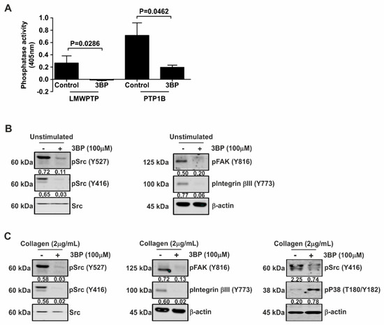 3-BP inhibits intracellular signaling in platelets. (A) Platelets were stimulated with collagen (2 μg/mL) and LMWPTP was immunoprecipitated. For PTP1B activity assay, active human recombinant protein was used. Following treatment with 3-BP, precipitates were subjected to phosphatase activity assays. Statistical analysis was performed using t-student (paired, 95% confidence intervals, two tailed) (n = 4). (B,C) Platelets were pretreated with 3-BP for 30 min and left either unstimulated (B) or were treated with collagen (C). Western blot analysis was performed for the indicated proteins, with β-actin serving as loading control. The numbers under the blot indicate densitometry values that were corrected for loading controls. A representative blot of at least two independent experiments is shown.