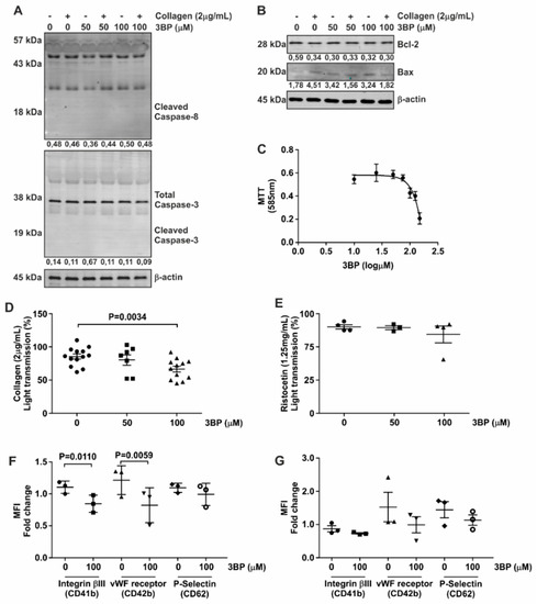 Based on the inhibitory effect of 3-BP on both kinases and phosphatases in platelets, we set out to investigate the functionality of these cells in the presence of this compound. We first confirmed that 3-BP was not cytotoxic to platelets, by demonstrating that neither caspase-3 nor caspase-8 integrity, both of which are cleaved upon apoptosis induction [28,29], were changed upon 3-BP treatment (Figure 3A). Furthermore, expression levels of pro-apoptotic BAX and the anti-apoptotic Bcl-2 proteins (Figure 3B) were unaffected by 3-BP treatment of platelets.