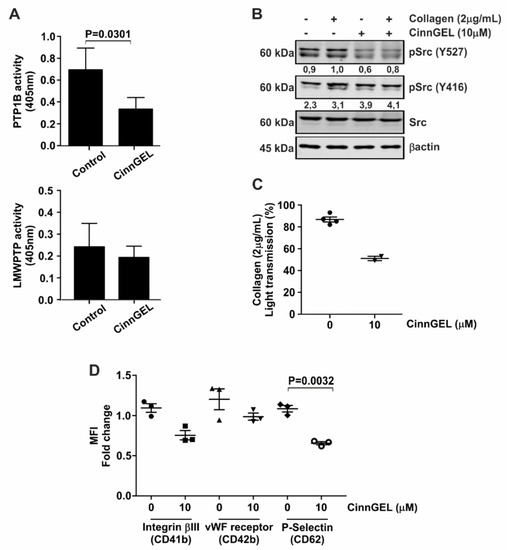 3-BP is not a specific inhibitor of PTPs. Therefore, to confirm the involvement of phosphatases in platelet activation, we employed the PTP1B inhibitor CinnGEL. As expected, CinnGEL specifically inhibits PTP1B (Figure 4A, upper panel), but not LMWPTP (Figure 4A, lower panel). Furthermore, inhibition of PTP1B was accompanied by a reduced activation of Src (Figure 4B). Investigation of platelet activation in the presence of CinnGEL demonstrated that platelet aggregation was significantly diminished upon PTP1B inhibition (Figure 4C). In addition, collagen-induced expression of platelet activation markers Integrinβ3, vWF receptor and P-Selectin were significantly reduced upon inhibition of PTP1B activity (Figure 4D). None of these platelet functions were affected by treatment with a selective inhibitor of the protein tyrosine phosphatase SHP1 (NSC87887) (Figure S1-III and Figure S2), demonstrating that specific protein tyrosine phosphatase activity is required for platelet functionality.