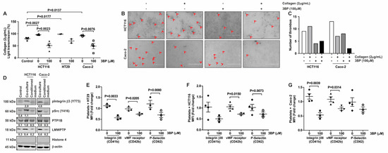 For co-culture experiments, colorectal cancer cells (HCT116, Caco-2 and HT29) (1.0 × 104 cells/cm2) were plated in 24-well plates for 24 h. After that, cells were washed with PBS, and PRP was added to each well for 6h, together with either collagen (2 µg/mL), 3-BP (100 µM), or no agonists. After co-culture, the cells were either imaged by microscopy (Nikon), and the platelet-tumor cell aggregates were counted using a 10× magnification, at the well center quadrant, or platelets were harvested and analyzed by western blot as described before [22].