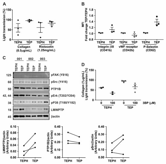 The following are available online at https://www.mdpi.com/2077-0383/8/7/936/s1, Figure S1: Supplemental Figure S1. Representative aggregation graphics from each experiment are combined in one file (pdf). I: Treatment of platelets with collagen/ristocetin in the absence or presence of the Src inhibitor PP2; II: Treatment of platelets with collagen/ristocetin in the absence or presence of 3-BP; Treatment of platelets with collagen in the absence or presence of the PTP1B inhibitor CinnGEL or the SHP inhibitor NSC87887; IV: Treatment of platelets with collagen in the absence or presence of tumor cells (Caco-2, HT29, HCT116) and 3-BP; V: Treatment of patient and control platelets with collagen/ristocetin; VI: Treatment of patient and control platelets with collagen/ristocetin in the absence or presence of 3-BP, Figure S2: Platelet function is not inhibited by selective SHP inhibitor. (A) Aggregation assays were performed for collagen-stimulated platelets after pretreatment with specific SHP inhibitor (NSC87887). (B) Cell surface expression of vWF-receptor (CD41-FITC), Integrinβ3 (CD42-PE) and P-Selectin (CD62-APC) was investigated on collagen-stimulated platelets that were pre-treated with specific SHP inhibitor (NSC87887). Table S1: Western blot antibodies, Table S2: Chemicals, Table S3: Cell line characteristics.