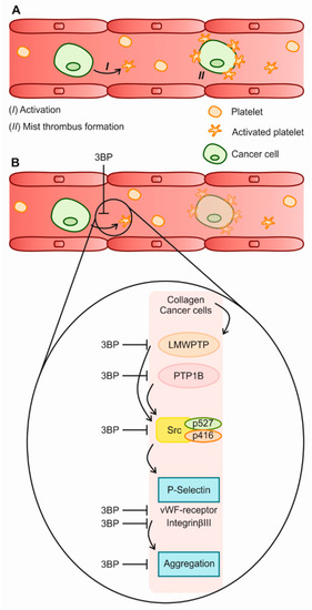 The 3-BP effect on platelet activation. (A) Platelets can be activated by collagen and tumor cells. (B) In the presence of 3-BP, the modulation of phosphatases plays contributes to a decreased platelet activity. This can culminate in a decreased aggregation, including cancer cell-platelet mist thrombi.
