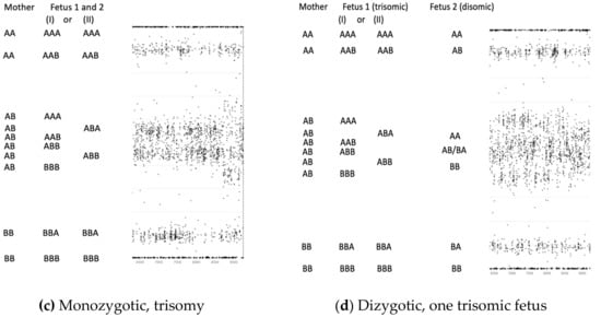 Heterozygosity plots for SNP alleles for a single chromosome in twins. Legend: x-axis—relative position of the SNP along the chromosome; y-axis—relative amount of the alleles (100% A at the top and 100% B allele at the bottom). (a) The pattern of SNPs in monozygotic twins is the same as in singleton pregnancies as there are only two different genotypes present. The relative vertical position of heterozygous alleles is determined by the fetal fraction, with two SNP bands at the top, three in the middle, and two at the bottom. (b) Dizygotic twins share zero, one, or two homologous regions of their genomes, depending on the recombination and inheritance patterns. The pattern for dizygotic twins differs from monozygotic twins over those regions where the twins share zero or one homologous regions due to the extra genotype present in the DNA mixture. Over those regions, there are more possible combinations alleles at a given SNP, meaning more bands. In this example, the fetal fraction for fetus 1 is less than that for fetus 2. (c) When trisomy is present in a monozygotic twin pregnancy, the number of bands change, with the number depending on the number of homologous regions from each parent. The pattern is similar to a singleton pregnancy where trisomy is present. Two alternative fetal genotypes are shown; I depict the situation where two homologs are inherited from the father, or where two identical homologs are inherited from the mother, and II is where one of each of the maternal homologs are present in the fetus. The pattern can change along the chromosome as a result of recombination. (d) The combination of a trisomy and disomy in a dizygotic twin pregnancy results in a complex pattern. Although more complex, the informatics can compute the two FFs and determine the presence of trisomy through comparison of relative SNP amounts across chromosomes.