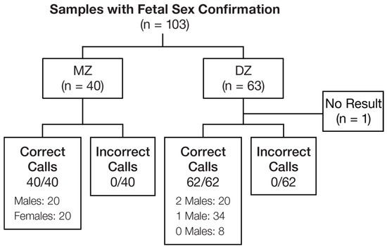 Fetal sex assessment was based on the analysis of 277 Y-chromosome loci. The number of male and female fetuses in each twin pregnancy was determined by relating the proportion of Y chromosomal DNA to the observed FF. Two males were called when the amount of Y chromosomal DNA was consistent with the sum of FFs; one male and one female were called when the amount of Y chromosomal DNA was consistent with one of the FFs; two females were called when no Y chromosomal DNA was detected. MZ fetal sex accuracy was defined as the proportion of MZ samples with a valid call that were correctly called as “two males” or “two females” for which confirmed gender information on both fetuses was available. DZ fetal sex accuracy was defined as the proportion of DZ pregnancies with gender truth on both fetuses that received a valid call and were correctly called as either “two males,” “one male and one female,” or “two females.” The overall fetal sex accuracy was computed using the weighted average of MZ and DZ cases that received a call. Fetal sex was only analyzed for cases with an aneuploidy result.