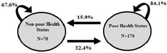 Of the transitions with initial poor health status, 15.9% transitioned to recovery in the following year, and 84.1% remained in a poor health status. In contrast, of the transitions with a non-poor health status at the beginning, 32.4% ended with a poor health status the year after.