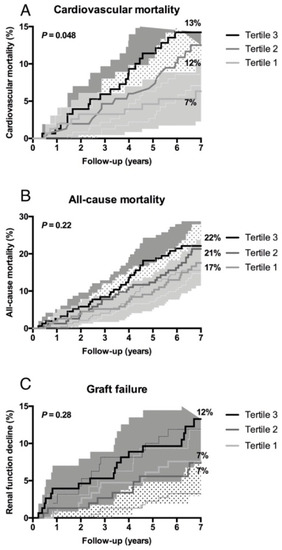 As shown in Figure 1, Kaplan Meier curves showed a significant association of tertiles of anti-apoA-1 IgG with CVD mortality (p = 0.048), but not with all-cause mortality (p = 0.22) or graft failure (p = 0.13).