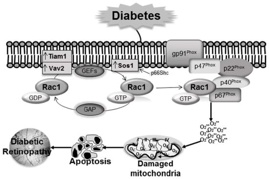 Rac1 plays a critical role in the pathophysiology of diabetic retinopathy by activating Nox2, which leads to excessive free radical generation. As mentioned above, in the pathogenesis of diabetic retinopathy, increased cytosolic ROS produced by Nox2 is an early event, which initiates a cascade of events that elicit mitochondrial damage and capillary cell apoptosis [15,21,39,40]. Activation of Rac1-Nox2-ROS also results in multiple downstream effects, and ROS-mediated alterations of many cellular processes lead to the pathological development and disease [15,41,42]. Experimental models have shown that ROS generated via Nox2 activation precedes mitochondrial damage. Once the mitochondria are damaged, the caspase signaling pathway is activated, resulting in cell apoptosis and the diabetic retinopathy pathology [15,43].