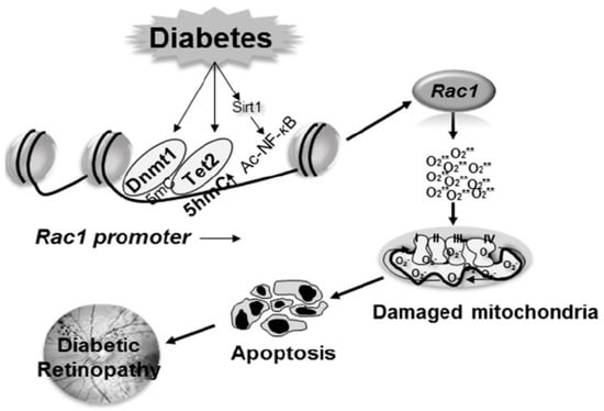 In conclusion, as detailed above, in the pathogenesis of diabetic retinopathy once mtDNA is damaged, due to dysfunctional electron transport chain, the vicious cycle of ROS continues to self-propagate, but activation of Rac1-Nox2 precedes mitochondrial damage. Thus, inhibition of Rac1 activation, an early event in the pathogenesis of diabetic retinopathy, will halt the vicious cycle of ROS accumulation, and ameliorate further progression of the disease. Furthermore, Rac1 is also associated with aberrant retinal neovascularization, and its inhibition during the advanced stages of retinopathy would also slow down neovascularization, a hallmark of proliferative diabetic retinopathy [48]. Optimistically, efforts are being put into developing strategies to regulate Rac1 activation for the treatment of other chronic diseases, and Dnmt inhibitors are also being used in clinical trials for tumors. The delivery of these drugs, along with maintenance of sensible glycemic control, holds promise to retard the development/progression of retinopathy, and prevent vision loss in diabetic patients.