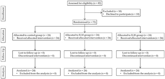 In total, 82 patients were assessed for eligibility, and 72 were enrolled in the study. All patients completed the study, and there were no missing or lost data. The study flow chart is presented in Figure 1.