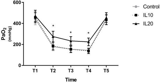 The PaO2. Error bars represent standard deviation. IL10, iloprost 10 μg group; IL20, iloprost 20 μg group; * indicates p < 0.0001 compared to the control group. T1, 15 min after changing the patient’s position to the lateral decubitus position with two-lung ventilation (TLV); T2, T3, T4, 10, 20, and 30 min after administration of iloprost in the lateral decubitus position with one-lung ventilation (OLV), respectively; and T5, 15 min after resuming TLV in the lateral decubitus position.