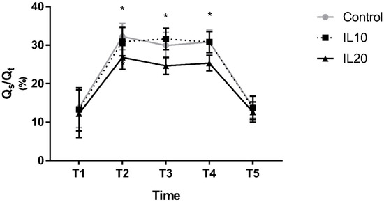 Changes in PaO2 after the initiation of OLV, and after resuming TLV, were similar among all three groups; compared to T1, PaO2 decreased significantly at T2, T3, and T4 and was comparable at T5. However, the degree of decrease in PaO2 at T2, T3, and T4 differed among the three groups. PaO2 in the IL10 group was comparable to that in the control group at T2, T3, and T4, whereas PaO2 in the IL20 group was significantly higher than that in the control group at T2, T3, and T4 (275.1 ± 50.8 vs. 179.3 ± 38.9, p < 0.0001 at T2; 233.9 ± 39.7 vs. 155.1 ± 26.5, p < 0.0001 at T3; and 224.6 ± 36.4 vs. 144.0 ± 22.9, p < 0.0001 at T4; Figure 2). Qs/Qt showed similar results. Compared to T1, Qs/Qt decreased significantly at T2, T3, and T4 and was comparable at T5 in all three groups. Qs/Qt in the IL10 group was comparable to that in the control group during OLV. However, Qs/Qt in the IL20 group was significantly lower than that in the control group (26.8 ± 3.1 vs. 32.2 ± 3.4, p < 0.0001 at T2; 24.6 ± 2.2 vs.29.9 ± 3.4, p < 0.0001 at T3; and 25.3 ± 2.0 vs. 30.8 ± 3.1, p < 0.0001 at T4; Figure 3).