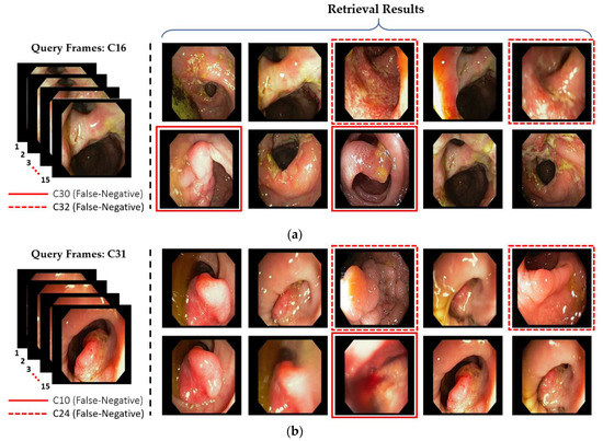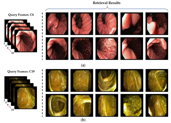 Our proposed deep CNN and LSTM-based classification framework shows the best performance with a high AUC of 97.057%. This remarkable performance of our proposed system increases its usability in the diagnosis of several GI diseases by automatically detecting different types of GI lesions or abnormalities, such as polyps, ulcers, or cancers from endoscopic videos. Our AI-based CAD system can assist the physicians in an effective diagnosis and treatment of many complex GI diseases. Furthermore, the classification of the endoscopic videos can, itself, be beneficial in retrieving the previously stored videos related to the current situation of a patient. Thus, the past cases can provide a path toward correct diagnostic decision. Therefore, we can also utilize our proposed classification framework for efficient endoscopic video frame retrieval by using the predicted class labels. The overall block diagram for our class prediction-based retrieval system is shown in Figure 15. In this retrieval section, the first step is to predict the actual class for the given query (i.e., successive endoscopic video frames). To predict the actual class label, a probability score corresponding to each class label is obtained for the given query by using our proposed classification framework. Based on the highest probability score, the corresponding class label is chosen as the actual class label. In the second step, the relevant cases related to input query frames are explored only within the predicted class based on feature matching. In this feature matching stage, the extracted spatiotemporal feature vector from the input query frames is matched one by one with the feature database of that predicted class by calculating the Euclidean distance. Based on the minimum distance, the frame index (i.e., name or ID information) is selected. Finally, the relevant frame is retrieved from the database by using the frame index information obtained in previous stage.