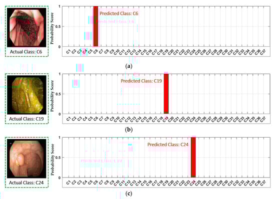 A few correctly retrieved examples are illustrated in Figure 16 by using our class prediction-based retrieval system. It can be observed that the retrieved endoscopic frames have high intra-class variance with varying illumination and contrast. However, our proposed system still outperforms with 100% retrieval performance for all the selected cases. Moreover, the classification performance for these selected example cases is also 100%, which can be observed in Figure 11 (confusion matrix performance for each class). Further, Figure 17 shows the probability score corresponding to each input query. It can be observed that the highest probability score is obtained for the actual predicted class, which shows that the proposed classification model is capable of extracting the discriminative features for the given query. In conclusion, this significant performance gain (in both classification and retrieval sections) shows that our method can be robust to the high intra-class variance of a dataset.