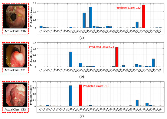 There are a few classes in our selected dataset that show the low retrieval performance, as shown in Figure 18. The primary reason for this performance degradation is the anatomical structural overlapping and identical shape of different GI lesions among different classes. Figure 18a shows a few incorrectly retrieved results as C30 (i.e., tuber adenoma in sigmoid colon) and C32 (i.e., ulcerative colitis in rectosigmoid part of large intestine) are retrieved for an input query of C16 (i.e., severe Crohn’s disease in terminal ileum of small intestine). It can be observed from Figure 18a that the lesion characteristics among these three classes (i.e., C16, C30, and C32) show a resemblance that may cause the incorrect retrieval. Similarly, certain other incorrect retrieval cases were obtained for an input query of C31 (i.e., polypoid cancer in sigmoid colon), C33 (i.e., severe Crohn’s disease in the rectum), and C34 (i.e., adenocarcinoma in the rectum) owing to identical lesion characteristics, as shown in Figure 18b–d. Moreover, Figure 19 shows the probability score corresponding to each input query in which significantly higher probability scores can be observed corresponding to multiple predicted class labels. These multiple higher scores show the structural or lesion similarities among multiple classes, which can result in classification errors. However, the retrieval performance in these cases can be enhanced by exploring the input query in multiple classes, which can be selected based on a multiple probability scores that is greater than a certain threshold.