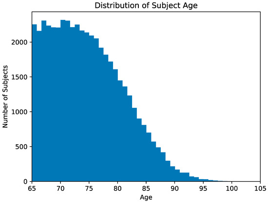 In addition, additional recall, precision, and F1 values for the classification models were calculated for patient cohorts classified by age. The patients were separated into six age groups: <70, 70–75, 75–80, 80–85, 85–90, and >90. Figure 1 presents a histogram of subjects classified by age.