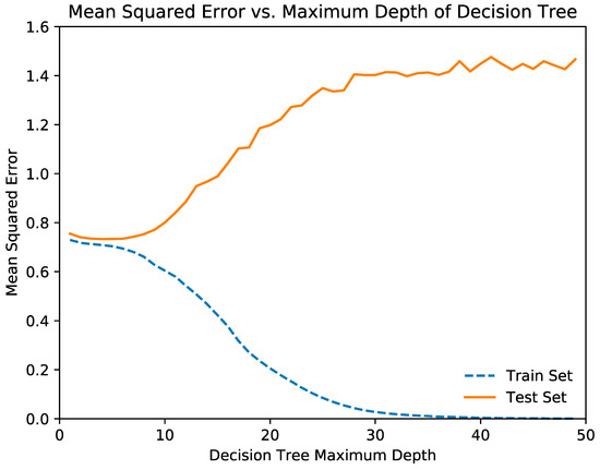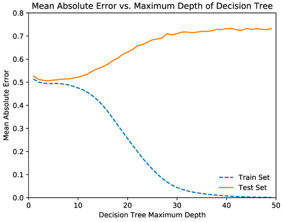 Figure 2 and Figure 3 illustrate the relationships of the decision tree depth with the mean squared error and mean absolute error, respectively. From the graph, we determined that the optimal maximum decision tree depth was 7, and we trained the decision tree model with this depth. Table 3 and Table 4 show the mean squared error and mean absolute error of the random forest and neural network regression models, respectively.