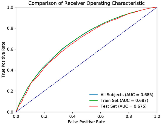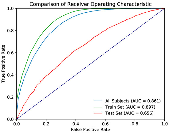 The ROC curves of both models were significantly better than the null hypothesis area of 0.5. Although the random forest model outperformed the artificial neural network in the train set and across all data, both models achieved similar performance in the test set.