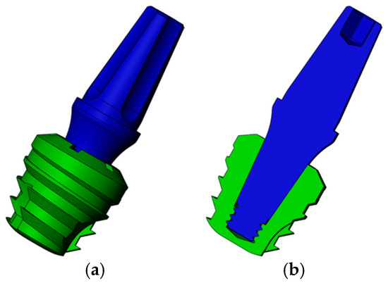 Three-dimensional model of Morse taper (MT) extra-short implants: (a) Implant in green and abutment in blue; (b) transversal cut of the model.