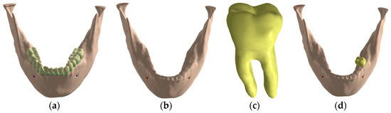 Jaw three-dimensional model: (a) Jaw with teeth; (b) edentulous jaw; (c) model of the extracted tooth; (d) tooth insertion in the edentulous mandible.