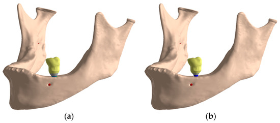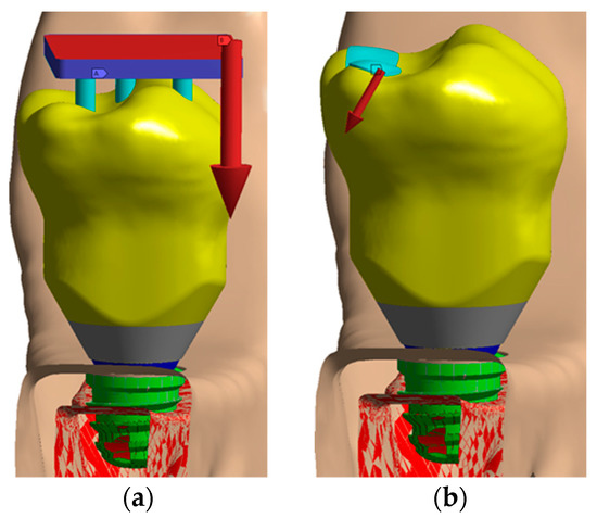 With the oblique loading, a vector load in the lingual-lingual direction was simulated with an angle of 30° as Figure 6b shows. Figure 6a details how the axial load was applied in the model.