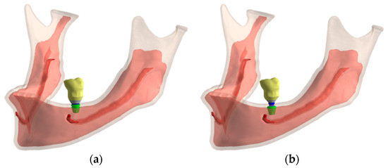 Non-linear contacts of the frictional type were simulated to approximate the simulation to the real condition, with a coefficient of friction value of 0.2 to simulate the contact between the titanium structures [33]. The contacts between the infrastructure and zinc phosphate cement were also configured with a coefficient of friction of 0.2 [34,35], since there is no perfect adhesion between the zinc phosphate cement and other structures, but only mechanical enmeshment [36]. All other contacts were simulated as a perfect adhesion, except for contact in the axial antagonist, as explained in next section. Rigid supports were added in the areas of insertion of the jaw lift muscles. The simulations were non-linear in relation to the contact.