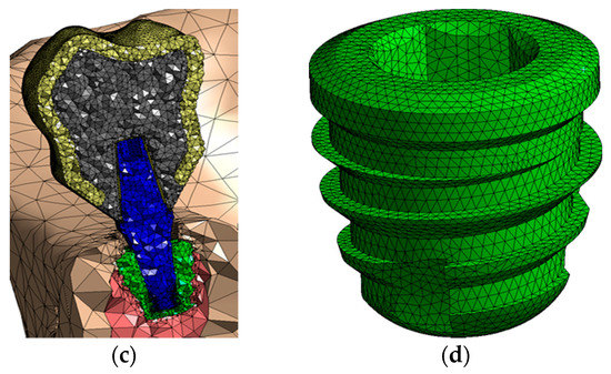 Mesh generated: (a) Whole assembly; (b) a view of the crown; (c) a transversal cut of the model; (d) IH implant.