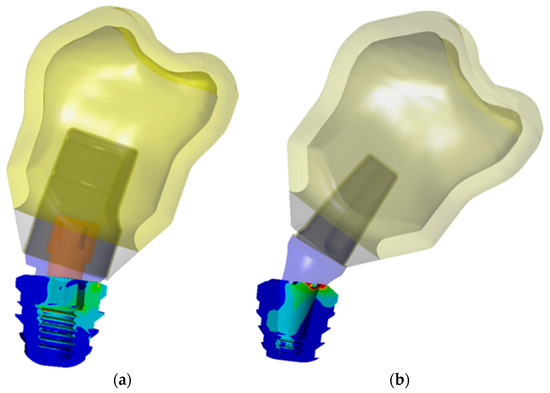 - Balik, A.; Karatas, M.O.; Keskin, H. Effects of different abutment connection designs on the stress distribution around five different implants: A 3-dimensional finite element analysis. J. Oral Implantol. 2012, 38, 491–496. [Google Scholar] [CrossRef]