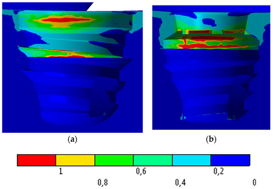 Stress concentrations on the IH implant are observed in the region of the first threads for the screw (Figure 8c). However, in the MT implant the highest stress occurs at the edges of the upper implant platform (Figure 8f).