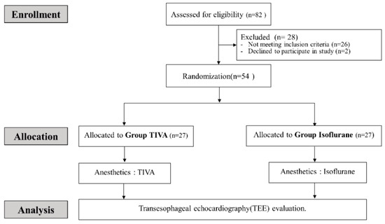This study was performed between March and Oct 2018 at the Samsung Medical Center (Seoul, Korea). A total of 82 patients undergoing cardiac surgery were assessed for eligibility. Of these patients, 56 met the inclusion and exclusion criteria. Two patients declined to participate. Therefore, 54 patients were enrolled by study staff (Figure 1).