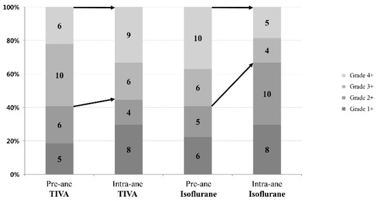 In our study, 16 patients (59%) in each group had pre-anesthesia MR grade 3 or 4. During anesthesia, 15 patients (94%) still had MR grade 3 or 4 in the TIVA group but only 9 patients (56%) maintained MR grade 3 or 4 in the isoflurane group (p = 0.26) (Figure 2). In Figure 3, pre- and intra-anesthesia MR grades were plotted with a diagonal line (no change). Most patients’ data points were around the diagonal line in the TIVA group, but most of those data points were plotted under the diagonal line in the isoflurane group because intra-anesthesia MR was lower than pre-anesthesia MR.