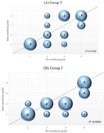 (A,B) Bubble plot. The TIVA group (A) maintained pre-anesthesia grade mitral regurgitation during anesthesia (p = 0.5438). The grade of mitral regurgitation showed a tendency of reduction during anesthesia in the isoflurane group (p = 0.0884) (B). Bubbles on the diagonal line indicate patients whose mitral regurgitation grade did not change during anesthesia. Bubbles under the diagonal line indicate patients whose MR grade decreased during anesthesia. Bubbles above the diagonal line indicate patients whose mitral regurgitation grade increased during anesthesia. X: Pre-anesthesia grade, Y: Intra-anesthesia grade.