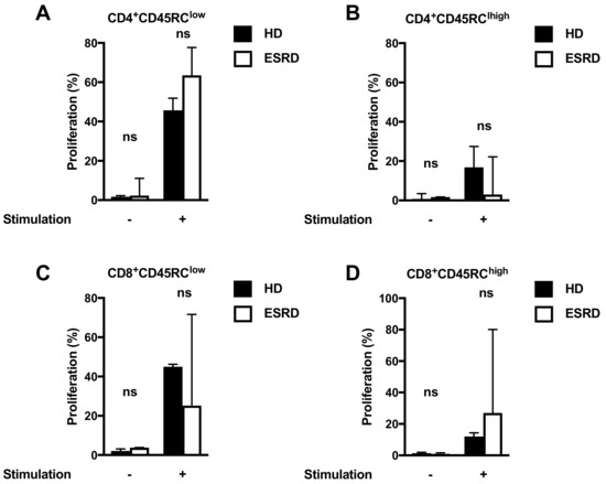 Analysis of proliferative capacities of CD45RClow and CD45RChigh T cells in ESRD patients and HD. After 72 h, the proliferation of activated CD4+CD45RClow (A), CD4+CD45RChigh (B), CD8+CD45RClow (C), and CD8+CD45RChigh (D) T cell subsets of ESRD patients (black bars) and HD (white bars) was analyzed. The experiment reported results of four ESRD patients and four age and matched HD. Error bars show the median with a 95% CI. Comparisons were done using the Wilcoxon matched-pairs rank test. ns, non-significant. CI, Confidence Interval; ESRD: end-stage renal disease; HD: heathy individuals.