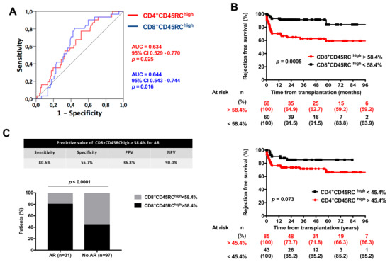 Predictive value of CD4+ and CD8+ CD45RC T cell subsets. (A) ROC curve analysis of CD4+ and CD8+ CD45RChigh T cell subsets for AR prediction. (B) Rejection-free survival of patients according to CD8+ (upper panel) and CD4+ CD45RChigh T cell proportions. Comparison between survivals was done using a log-rank test. (C) predictive values of CD8+ CD45RChigh T cell above 58.4% for AR prediction. AUC: Area Under Curve.