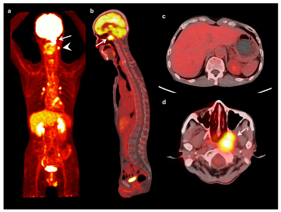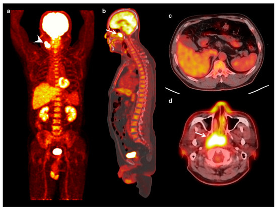 Maximum intensity projection (a) and sagittal (b) FDG PET images and fused transaxial FDG PET/CT images (c,d) of a 64-year-old man with nasopharyngeal cancer. A 3 cm-sized mass in the left nasopharynx showed intensely increased FDG uptake (arrow) (maximum SUV 9.53, metabolic tumor volume 28.83 cm3, and total lesion glycolysis 132.62 g) with ipsilateral neck lymph node metastases (arrowhead). Serum CRP level, NLR, and PLR of the patients were 3.02 mg/dL, 2.53, and 212.38, respectively. On FDG PET/CT, only a mild degree of FDG uptake was shown in the bone marrow (BM SUV of 1.13 and BLR of 0.64). The patient was clinically diagnosed with T3N1, stage III, and underwent concurrent chemoradiotherapy. The patient has not experienced cancer progression during 48.8 months of follow-up.
