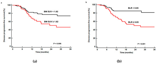 Cumulative disease progression-free survival curves according to BM SUV (a) and BLR (b). Patients with low BM SUV (<1.82) and BLR (<0.85) showed significantly better disease progression-free survival (p = 0.006 for BM SUV and p < 0.001 for BLR) than those with high BM SUV (≥1.82) and BLR (≥0.85), respectively.