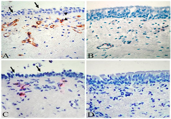 Biopsy sections from a child with asthma (A,C), and a control child (B,D). An increased number of subepithelial vessels (A, brown) and eosinophils (C, red) are demonstrated in the child with asthma. The arrows indicate loss of epithelial cells (A,C), while the arrowheads indicate reticular basement membrane thickening (A). Immunostaining with monoclonal antibody anti-CD31 (A,B) and anti-EG2 (C,D). Original magnification ×630. Reprinted with permission of the American Thoracic Society from [].