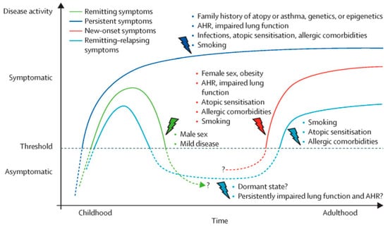 Further important determinants of persistent symptoms include prenatal features (preterm birth and low birth weight), pulmonary function deficits and reduced breast feeding in early infancy, as well as indoor and outdoor exposures—particularly to environmental pollutants and cigarette smoking []. In the present review we focus mainly on the role of atopy and viral infections, the pathogenetic mechanisms of which are better known.