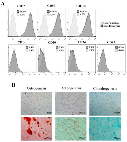 The immunophenotype of hPDLSCs was evaluated by flow cytometry after the third passage, and the expression of mesenchymal stem cell surface markers was analyzed using flow cytometry. Briefly, hPDLSCs were washed with phosphate buffered saline (PBS) and incubated in the dark for 15 min at 4 °C with the following antibodies: APC-conjugated anti-CD73 (clone AD2), FITC-conjugated anti-CD90 (clone DG3), PE-conjugated anti-CD105 (clone 43A4E1), and PerCP-conjugated anti-CD34 (clone AC136), CD45 (clone 5B1), CD14 (clone (TÜK4), and CD20 (clone LT20.B4) (all from Miltenyi Biotec, Bergisch Gladbach, Germany). After labeling, cells were washed twice, resuspended in PBS, and analyzed in a FACSCalibur flow cytometer (at least 50,000 cells per condition). The results were analyzed using FlowJo software (FlowJo LLC, Ashland, OR, USA) [17]. The medium was refreshed every 3 days. Also, to analyze the in vitro multipotential differentiation ability of hPDLSCs, cells were cultured in OsteoDiff media, AdipoDiff media, and CondroDiff media (Miltenyi Biotec, Bergisch Gladbach, Germany) for 4 weeks to induce osteogenic, adipogenic, and chondrogenic differentiation, respectively. Osteogenesis was demonstrated by mineralization and assessed by Alizarin red staining (Sigma-Aldrich, St. Louis, MO, USA). Adipogenesis was evaluated with Oil Red O solution (Sigma-Aldrich, St. Louis, MO, USA) to detect accumulation of neutral lipid droplets. Finally, chondrogenic differentiation was verified with Alcian blue staining (Sigma-Aldrich, St. Louis, MO, USA) to detect glycosaminoglycans.