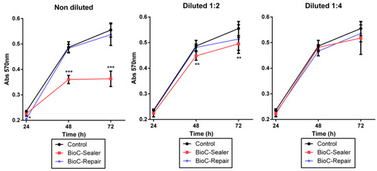 The cytotoxicity results of the control and experimental groups are shown in Figure 2. After 72 h of culture, Bio-C Repair exhibited similar cell viability when compared to the control condition with no significant difference between them. Conversely, undiluted and ½ dilution of Bio-C Sealer produced a statistically significant reduction in cellular viability after 72 h (*** p < 0.001; ** p < 0.01, respectively). However, no significant differences in cell viability were observed after incubation with ¼ dilution of Bio-C Sealer compared to the control group (treated with culture media only) (Figure 2).
