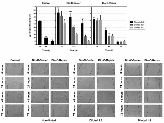 The wound area was determined after the removal of the scarring insert and percentage of open wound was determined in the following 24, 48 and 72 h. hours. Treatment with 1/1 and 1/2 dilutions of Bio-C Sealer induced a significantly lower cell migration rate than observed using complete medium (control) (* p < 0.05; ** p < 0.01; *** p < 0.001) (Figure 3). However, Bio-C Repair promoted wound closure after 72 h of treatment, obtaining comparable levels of migration to those observed with the control group. Collectively, the results showed that Bio-C Repair and 1/4 dilution of Bio-C Sealer allowed the migration of hPDLSCs.
