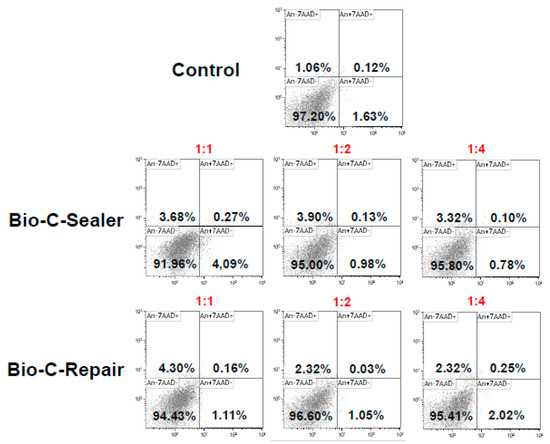 Figure 4 shows the results of flow cytometry, used to study the apoptotic/necrotic effect of the BEC eluates on hPDLSCs. The percentages of cell survival with undiluted extracts of Bio-C Sealer and Bio-C Repair were 91.96% and 94.42%, respectively, and with 1:2 and 1:4 dilutions of BECs the percentages of cell survival were ≥95%.