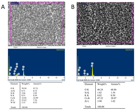 EDX was used as an analytic technique for chemical characterization and identification of the major elements present in each disc samples. As displayed in Figure 6, EDX detected the presence of oxygen, silicon, calcium, potassium, and zirconium in Bio-C Sealer or Bio-C Repair with different percentages. No carbon was found in Bio-C Sealer or Bio-C Repair (Figure 6). Traces of aluminum and tungsten were only found in Bio-C Sealer.
