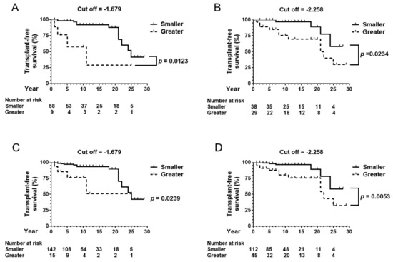 In the total cohort, 157 patients were followed up for one year or more (Table 1). Seventeen patients died, and two patients were transferred to other hospitals for liver transplantation during the observation period. The cut-off ALBI score of −1.679 differentiated the patients’ transplant-free survival in the total cohort, as shown in Figure 2C (p < 0.05). The alternative cut-off value of −2.258 also divided the cohort based on transplant-free survival (Figure 2D, p < 0.05).